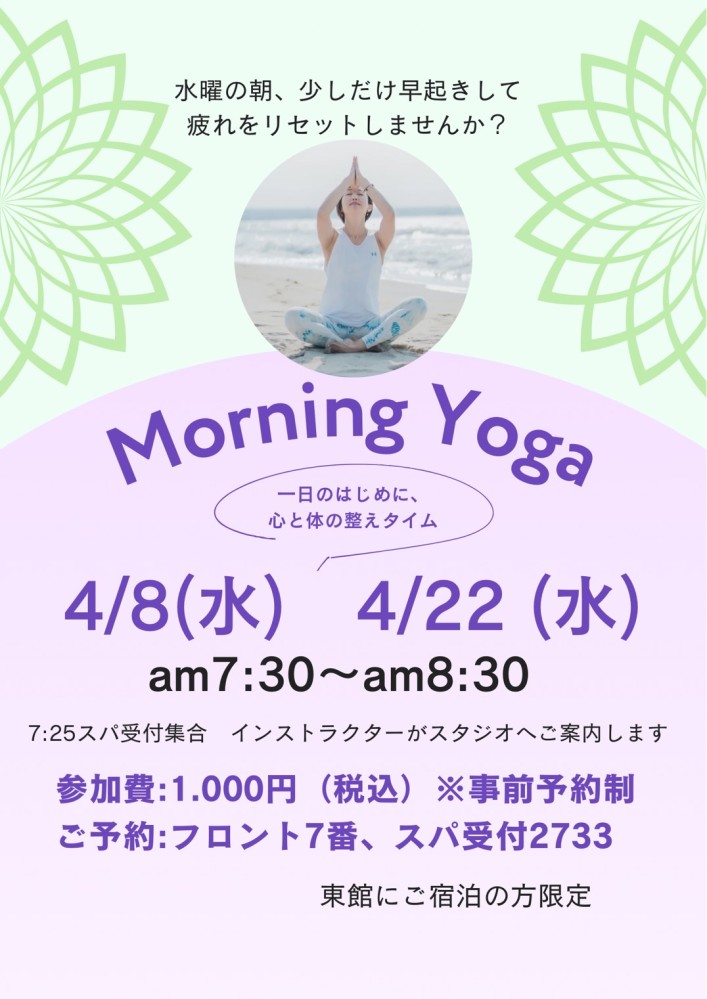 唐津シーサイドホテルリトリート企画として、4月に朝ヨガを行います。東館ご宿泊のお客様限定で親切丁寧にご指導いたします。一日の始まりに心と体のリラックスを!